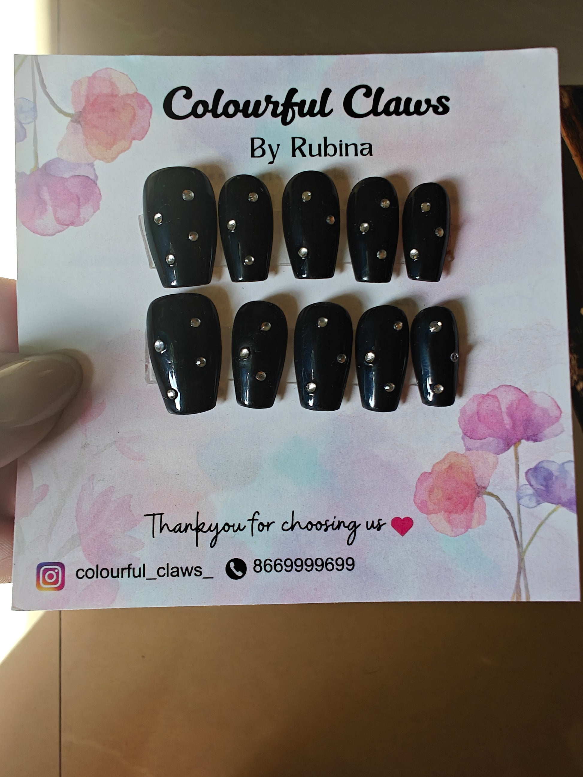 Turn heads instantly with our black solid base coffin-shaped false press-on nails adorned with all-over rhinestones. Perfect for working women and busy moms, these nails add effortless party-ready glam in minutes—no salon visit needed! Reusable, stylish, and elegant—because confidence starts at your fingertips