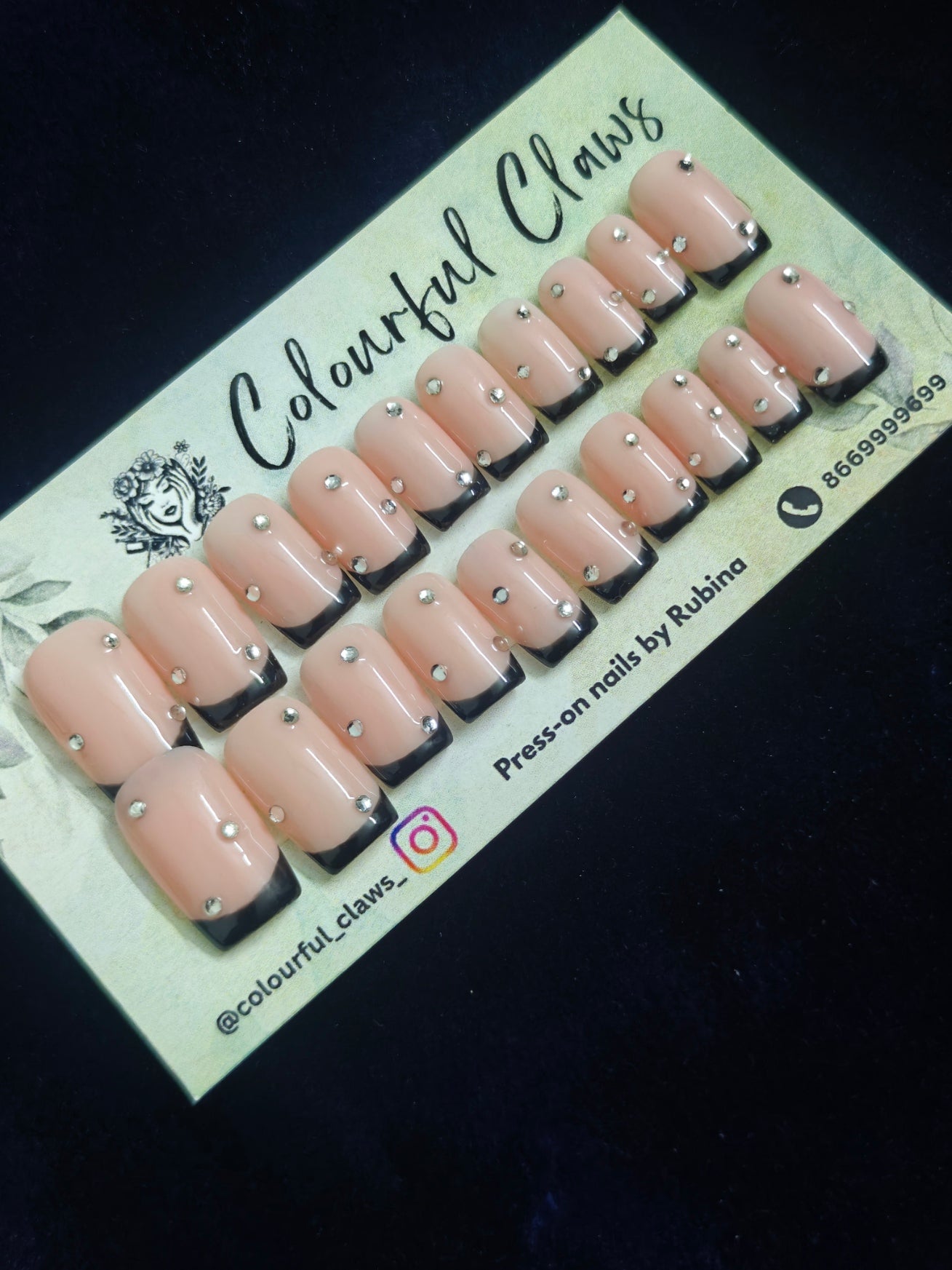 Black French With Rhinestone Elevate your nail game with timeless sophistication. This stunning set of 24 pre-designed nails features classic black French tips adorned with sparkling rhinestones for an instant glamorous finish. Perfect for busy professionals seeking polished elegance without the salon wait, these nails deliver a refined, upscale appearance in minutes. Whether for everyday sophistication or special occasions, achieve that coveted luxury look effortlessly. Simply apply and shine.