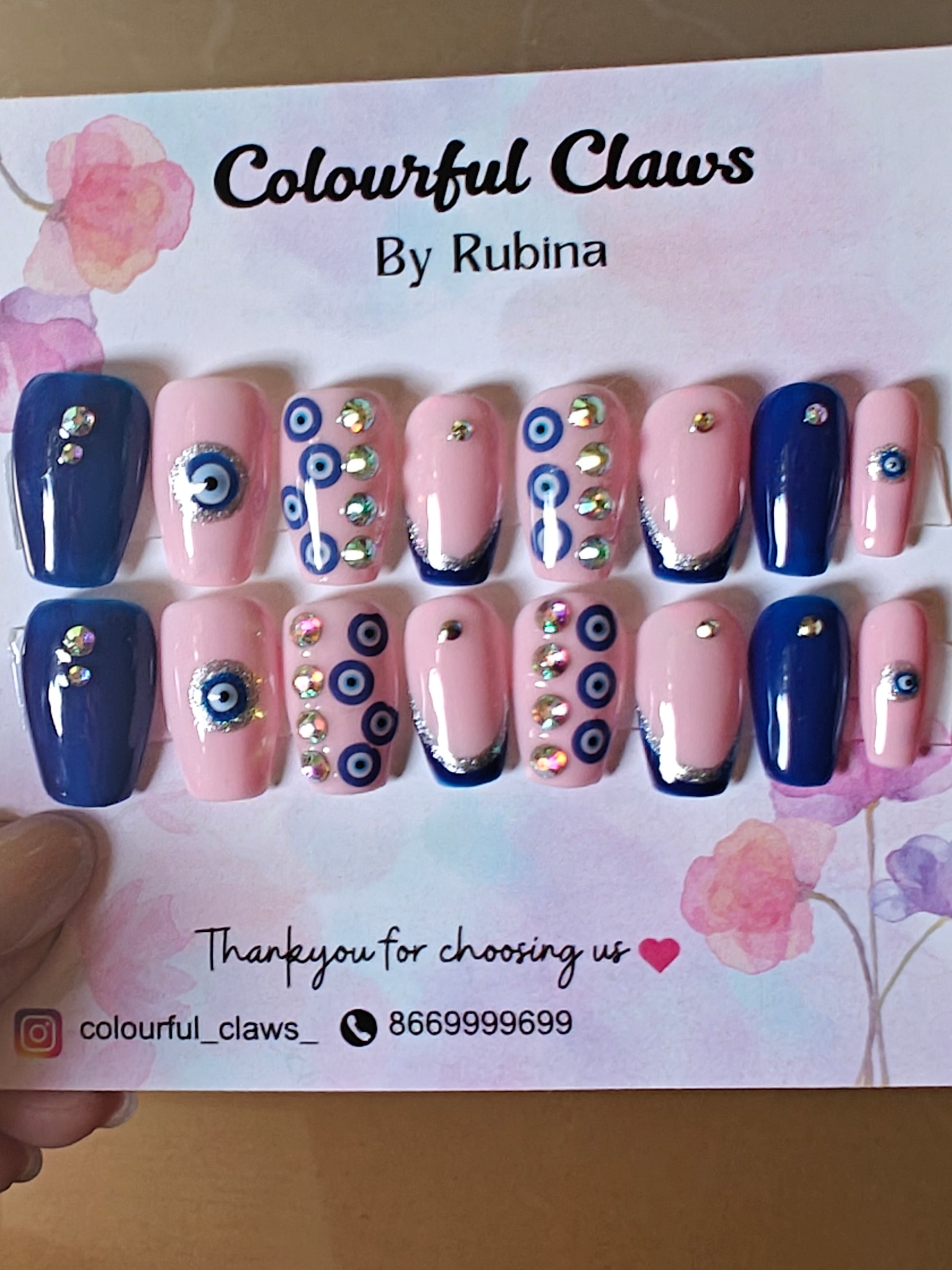 #PressOnNails #EvilEyeNails #BlueAndPinkNails #ColourfulClaws