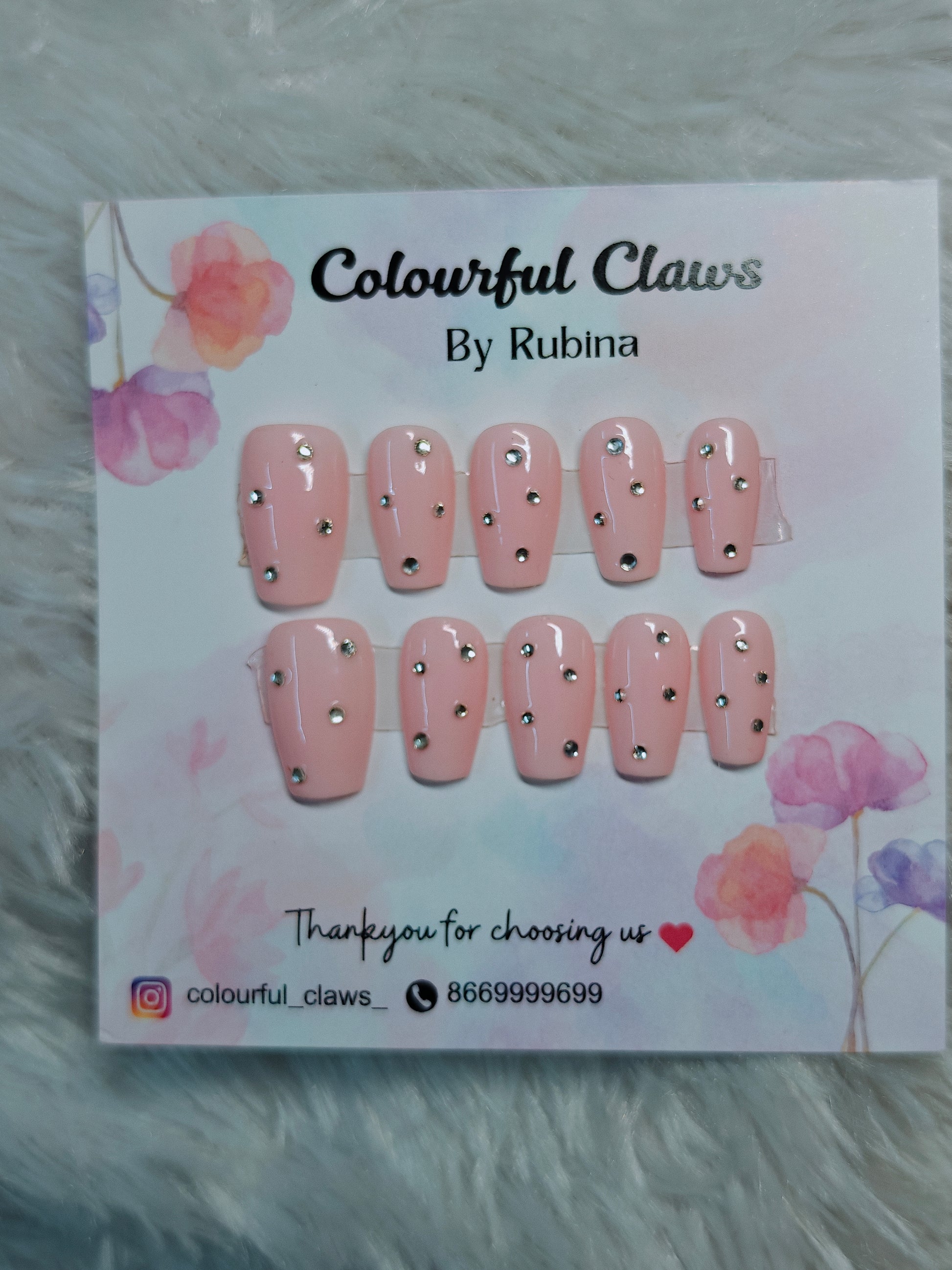Turn heads instantly with our pink solid base coffin-shaped false press-on nails adorned with all-over rhinestones. Perfect for working women and busy moms, these nails add effortless party-ready glam in minutes—no salon visit needed! Reusable, stylish, and elegant—because confidence starts at your fingertips
